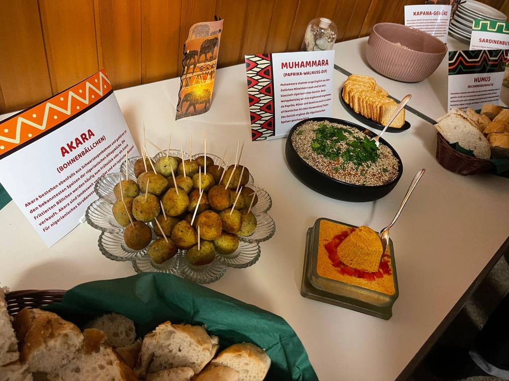Im Anschluss an den Gottesdienst waren alle Gäste eingeladen, den Abend in geselliger Runde ausklingen zu lassen. Das Team der Kirchengemeinde Bühlertal hatte mit viel Liebe eine große Auswahl an nigerianischen Speisen vorbereitet. Von herzhaften Spezialitäten über Getränke bis hin zu süßen Desserts war für jeden Geschmack etwas dabei und bot den Besucherinnen und Besuchern eine kulinarische Reise nach Westafrika.
